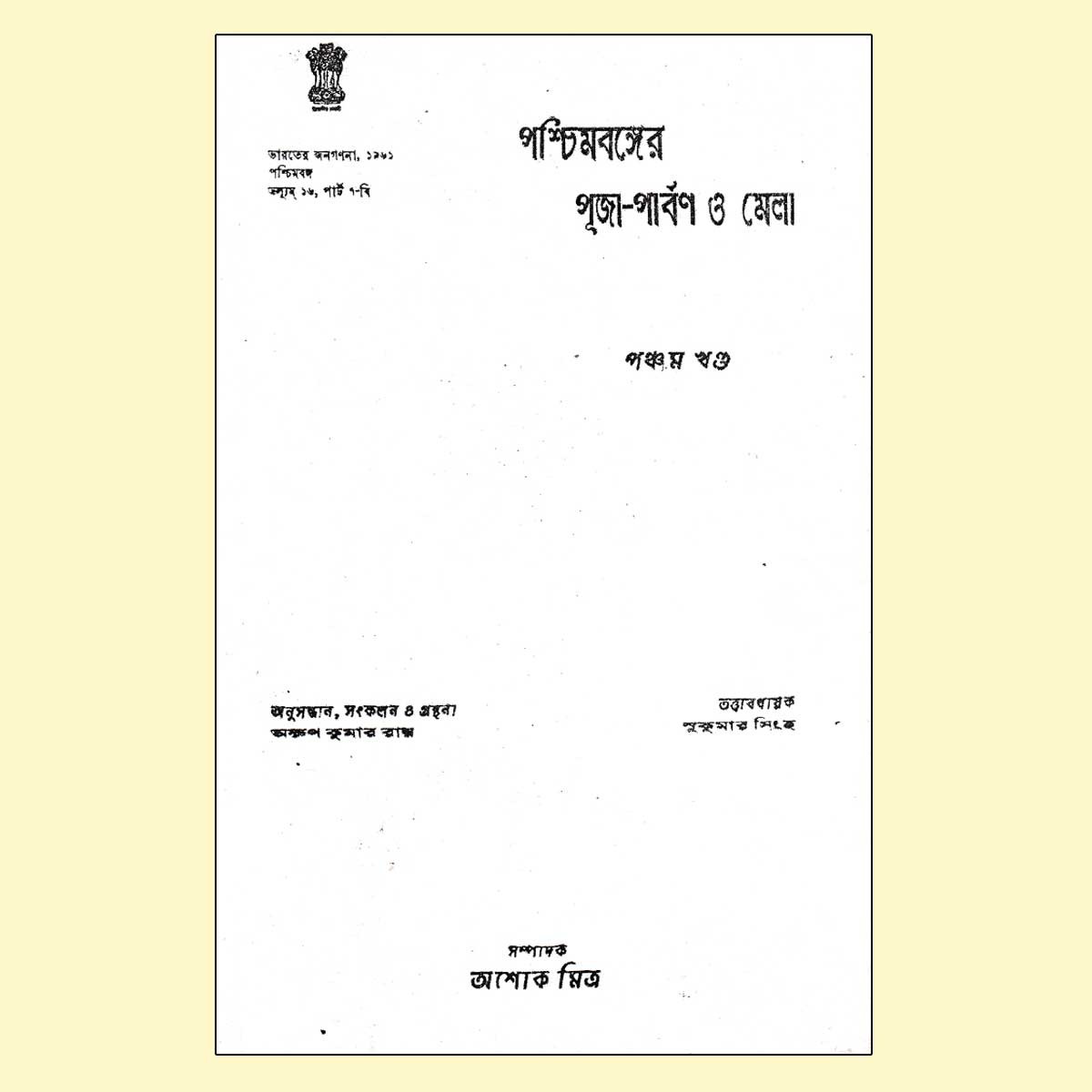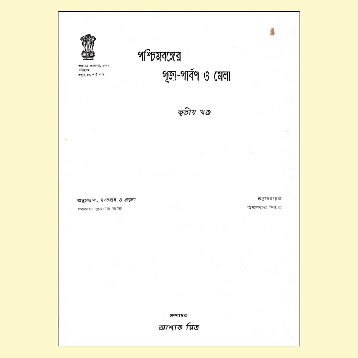 ‘পশ্চিমবঙ্গের পূজাপার্বণ ও মেলা’র প্রথম খণ্ড প্রকাশিত হয় ১৯৬৬ সালে। এই রাজ্যের সমস্ত জেলা, শহর, গ্রাম, মফস্সলে কত বিচিত্র রকমের রীতি, মেলার, পার্বণের আয়োজন প্রায় চোখে লাগার মতো। এক একটি সম্প্রদায় প্রজন্মের পর প্রজন্ম তাঁদের নিজস্ব সংস্কৃতিকে বাঁচিয়ে রেখেছেন পার্বণ এবং মেলার মাধ্যমে। সেই নিয়েই একটি গবেষণাধর্মী আকর গ্রন্থ ‘পশ্চিমবঙ্গের পূজাপার্বণ ও মেলা’। অনুসন্ধান, সংকলন ও গ্রন্থনার দায়িত্বে অরুণ কুমার রায়। তত্ত্বাবধায়ক সুকুমার সিংহ এবং সম্পাদনা করেছেন অশোক মিত্র। প্রত্যেকটি খণ্ডে মানচিত্র সংগ্রহ করেছেন জলধী দাশগুপ্ত এবং সুবীর চট্টোপাধ্যায়। রেখাচিত্র এবং প্রচ্ছদ এঁকেছেন জিতেন দাস।