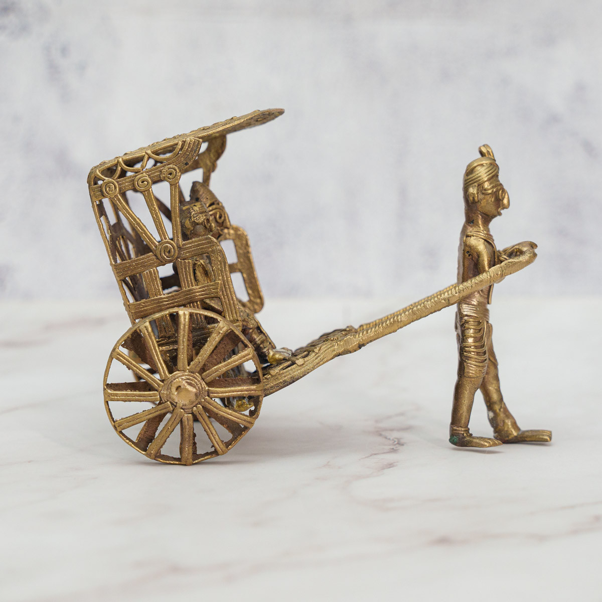 This particular artifact depicts a man pulling a hand rickshaw along with two people sitting on it.