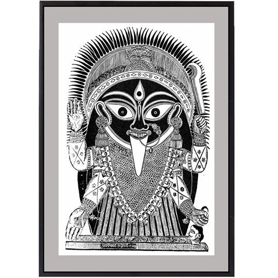 This is a 10 x 15-inch size plate-litho transfer of the Kali woodcut by Benimadhab Bhattacharya during the early 19th Century.