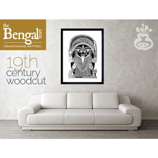 This 19th Century Bengal Woodcut was printed on newsprint like paper to keep the cost low. Due to the advent of lithography, the Battala woodcut printing had a remarkably short run and very few of these prints have survived the cheap paper and humid conditions of the region. The Dark Goddess of Kalighat, originally carved out on wood byBenimadhab Bhattacharya during the 19th Century has been plate-litho transferred by The Bengal Store for you.