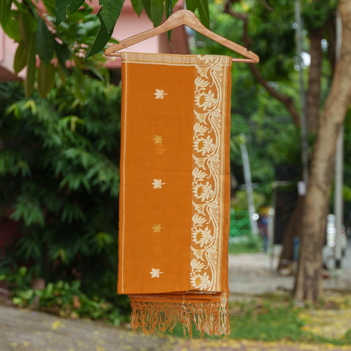 The vibrant hues of this saree are evocative of the colours of the first morning light. Its borders are adorned with blooming lotuses and lotus leaves, revealing the beauty of Bengal's riverine ponds. This exquisite creation has been christened 'Kamallata.' Designed by Shyam Biswas and handwoven by skilled artisans, this pure cotton (100%) saree with a thread count of 92x92 is a testament to the everlasting natural beauty of Bengal.